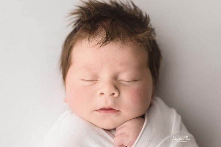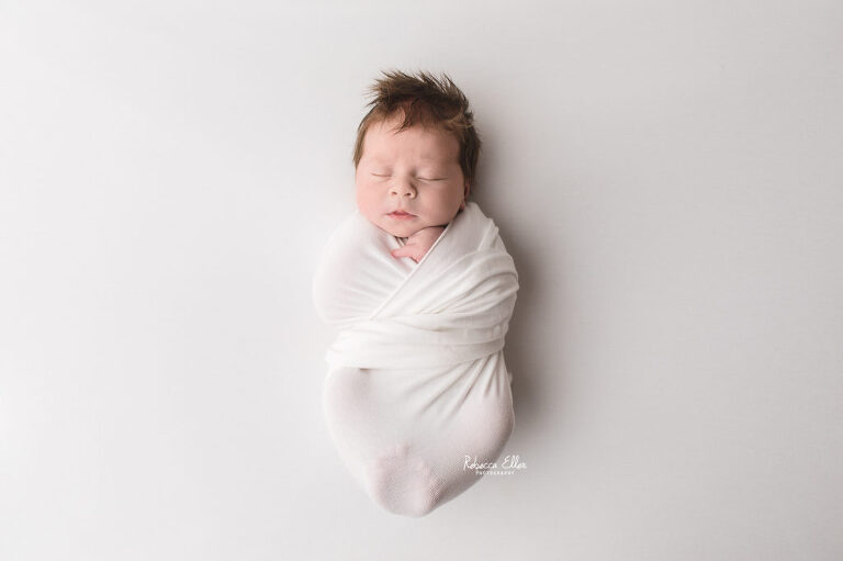 I recently started offing more of a lifestyle type session. My style has always been simple with minimal use of props, but now in this lifestyle type newborn session there are no props, just strictly baby in a white bodysuit or swaddle. It is a very airy light feeling of having baby unposed and natural on a white blanket backdrop.